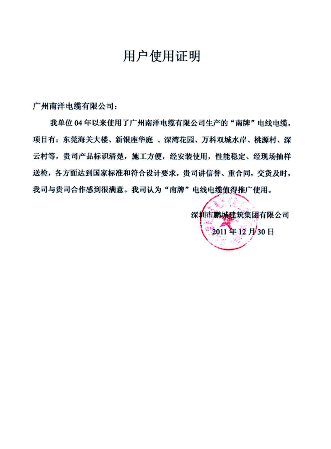 深圳市鵬城建筑集團有限公司用戶使用證明
