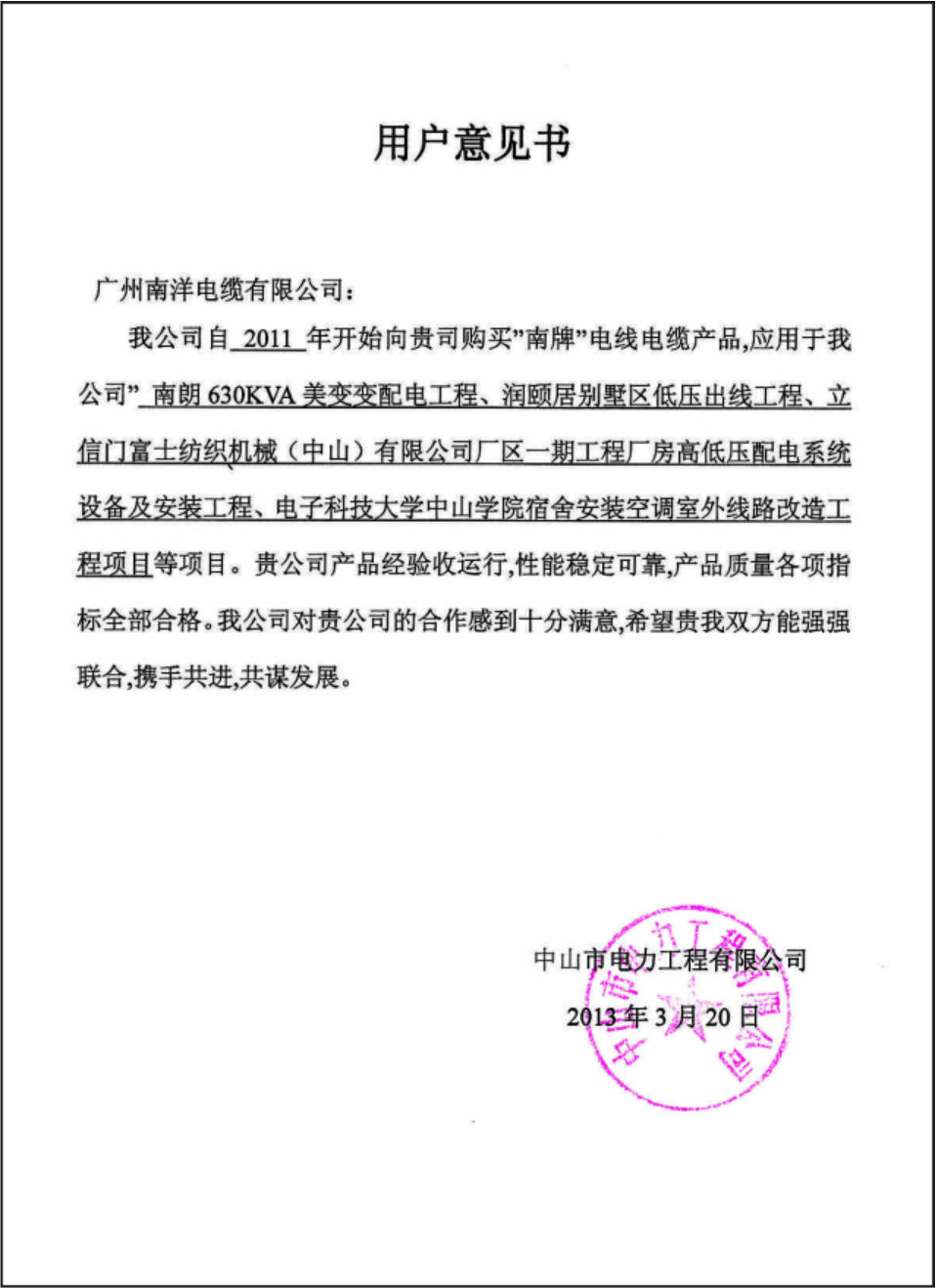 中山電力用戶意見書